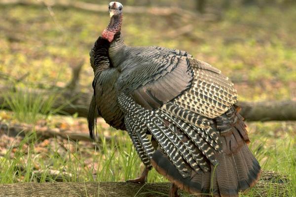 3、火鸡的背部稍隆起,体羽一般呈金属褐色或绿色,散布黑色的横斑,两翅有白斑,尾羽一般为褐色或灰色(雄性火鸡可展开尾羽,呈扇形),具斑驳,末端稍圆,脚和趾较强壮。